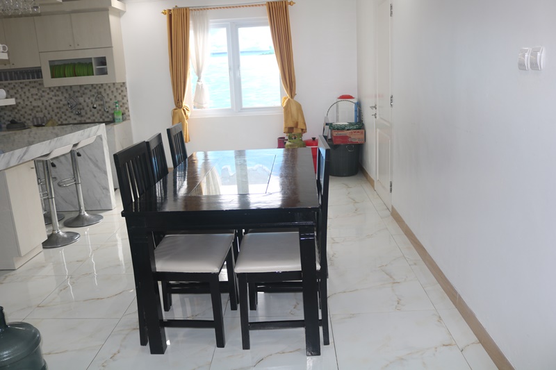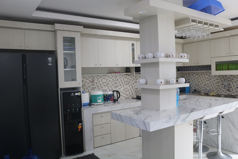 Bagi Anda yang gemar memasak atau ingin menyiapkan makanan sendiri, dapur di villa ini telah dilengkapi dengan berbagai peralatan masak yang memadai. Termasuk di dalamnya adalah alat makan lengkap, tabung gas, dispenser dengan galon air AQUA gratis, serta kulkas dua pintu untuk menyimpan bahan makanan dan minuman Anda.